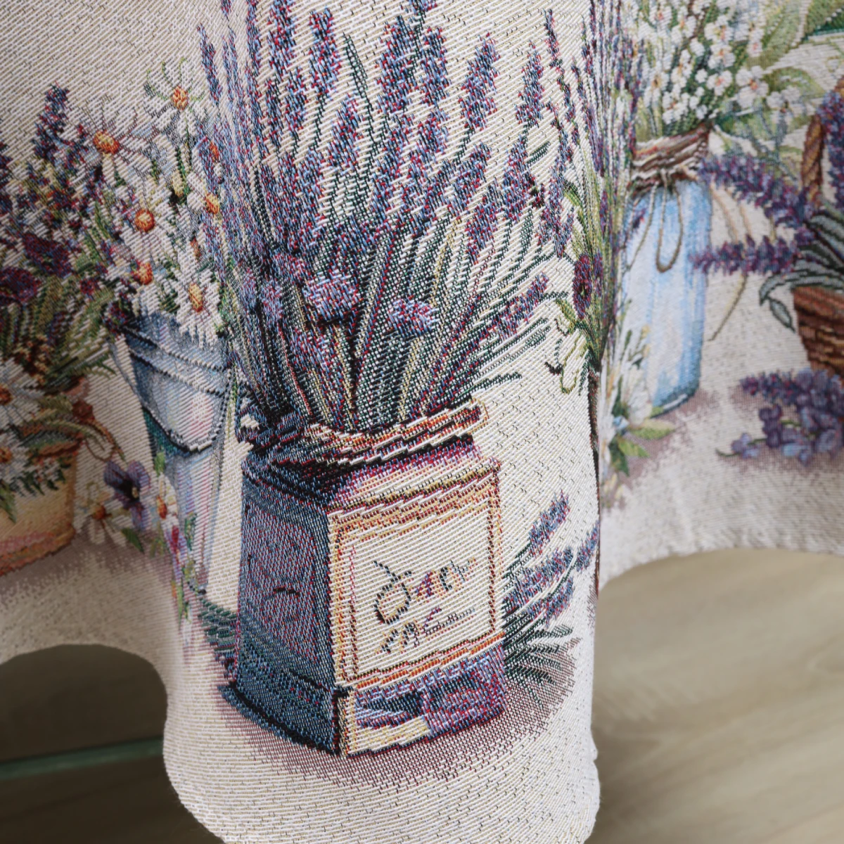 Apvali staltiesė iš gobeleno medžiagos. Gobelenas yra tankus žakardo audinys. Pagrindas yra sudarytas iš medvilnės, audimo siūlai – mišrios sudėties (poliesterio ir akrilo).
