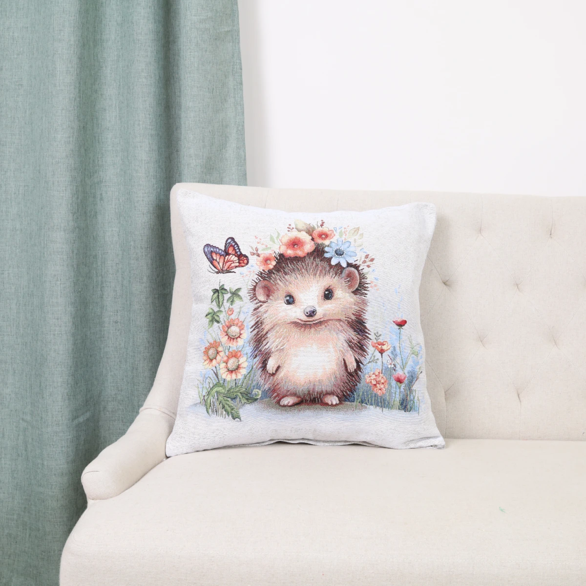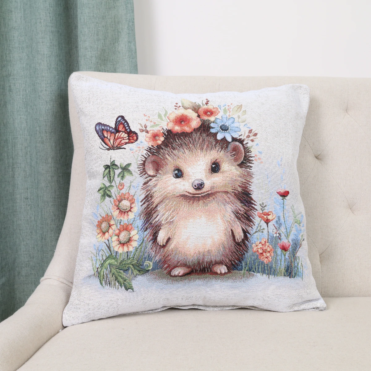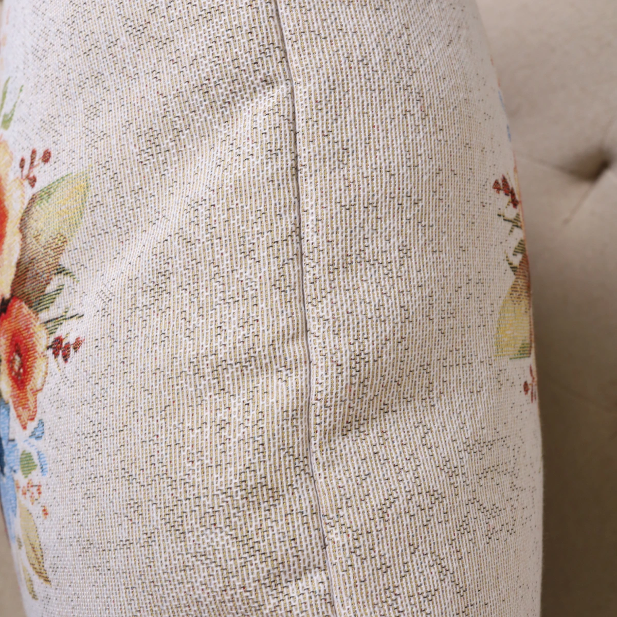 Dekoratyvinė pagalvėlė iš gobeleno medžiagos. Gobelenas yra tankus žakardo audinys. Pagrindas yra sudarytas iš medvilnės, audimo siūlai – mišrios sudėties (poliesterio ir akrilo).