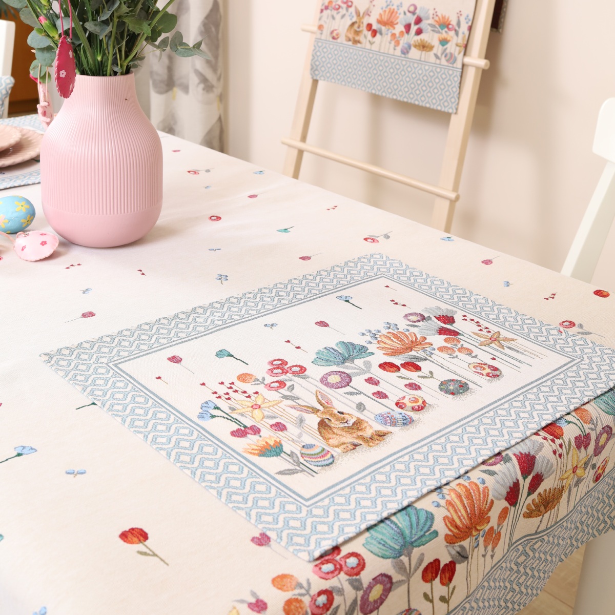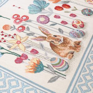Servetėlė iš gobeleno medžiagos. Gobelenas yra tankus žakardo audinys. Pagrindas yra sudarytas iš medvilnės, audimo siūlai – mišrios sudėties (poliesterio ir akrilo).