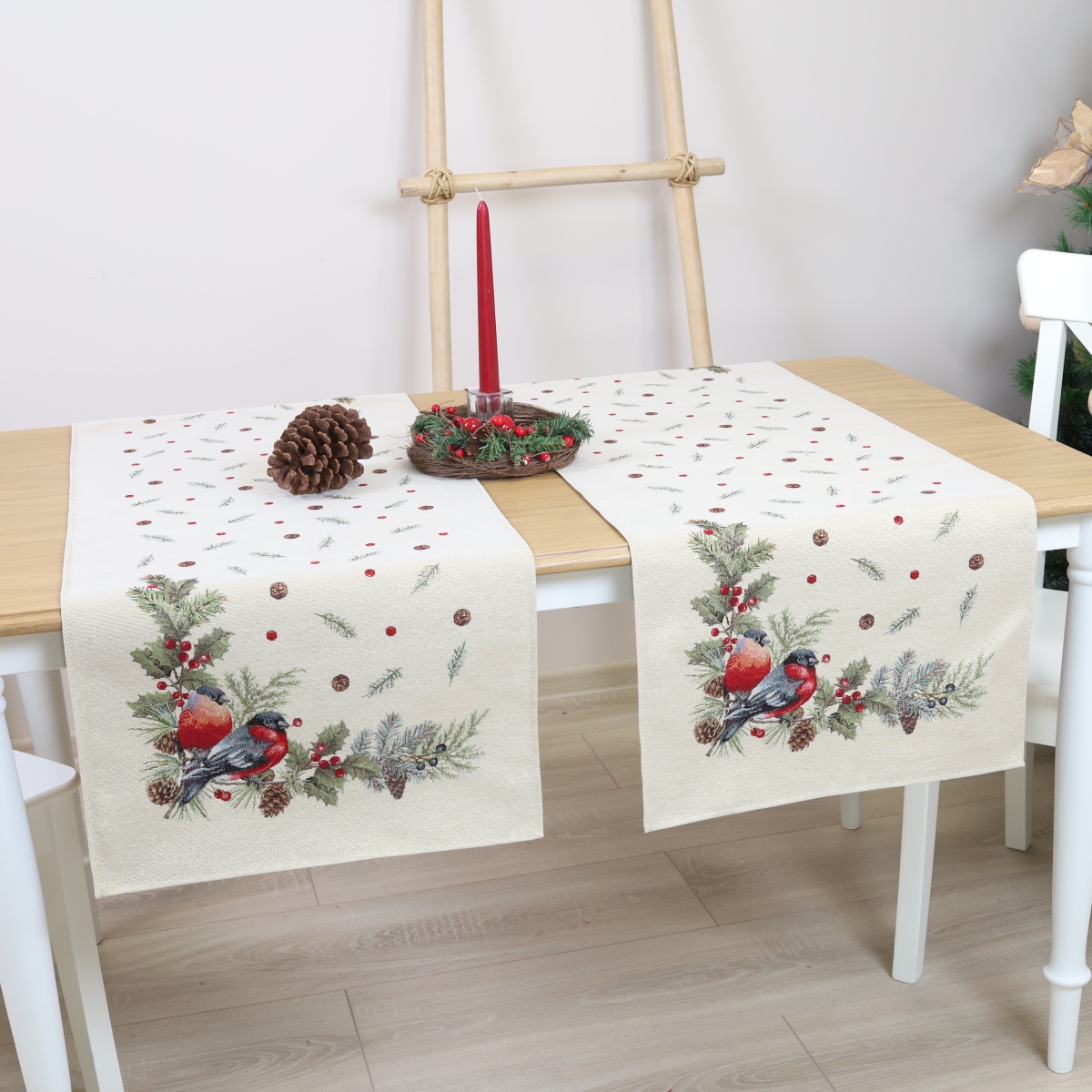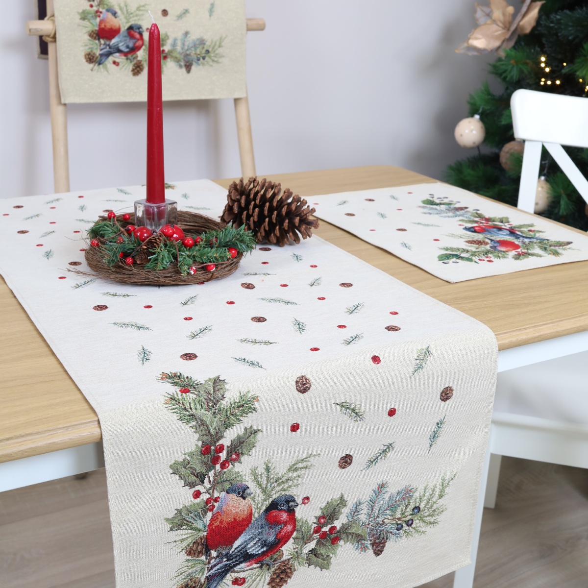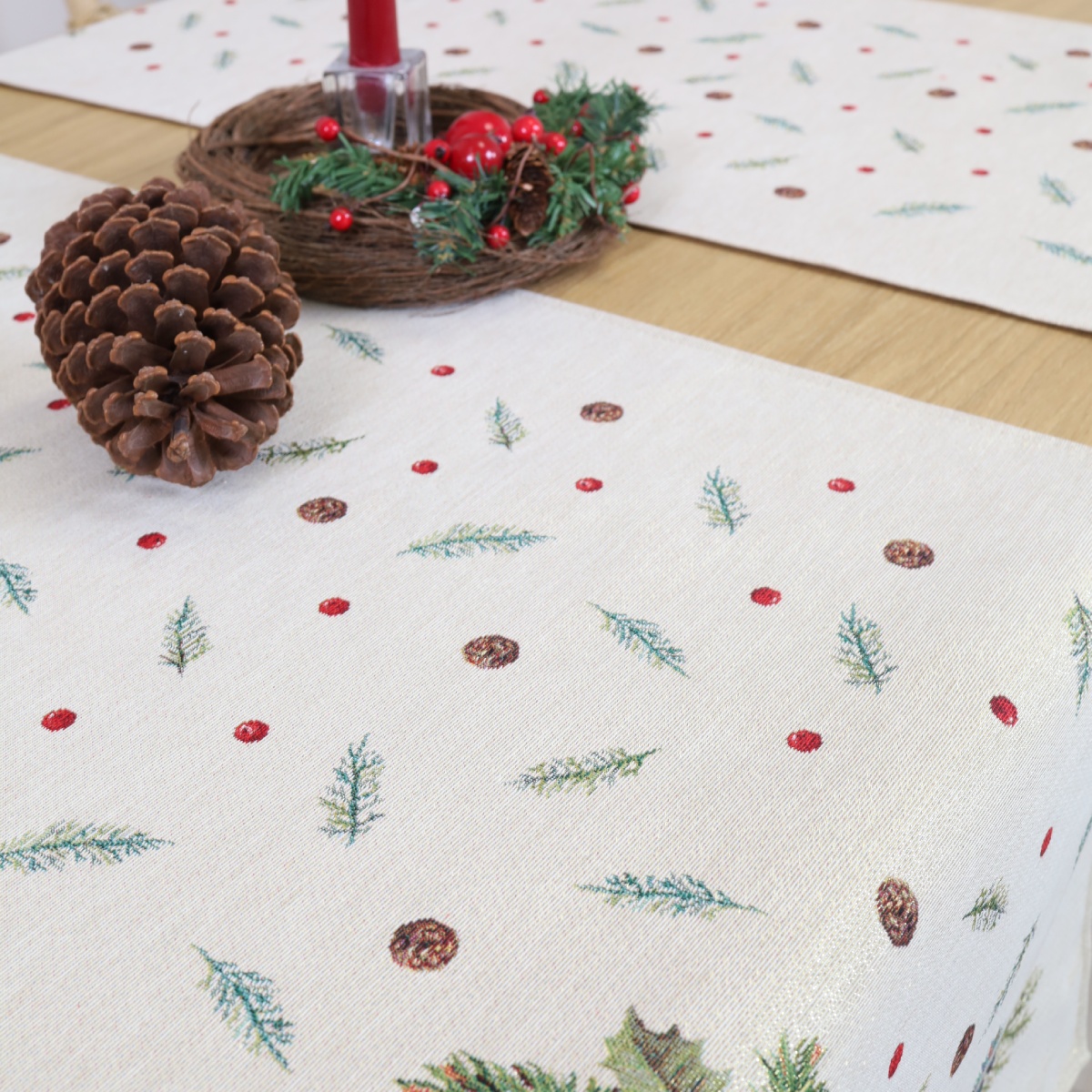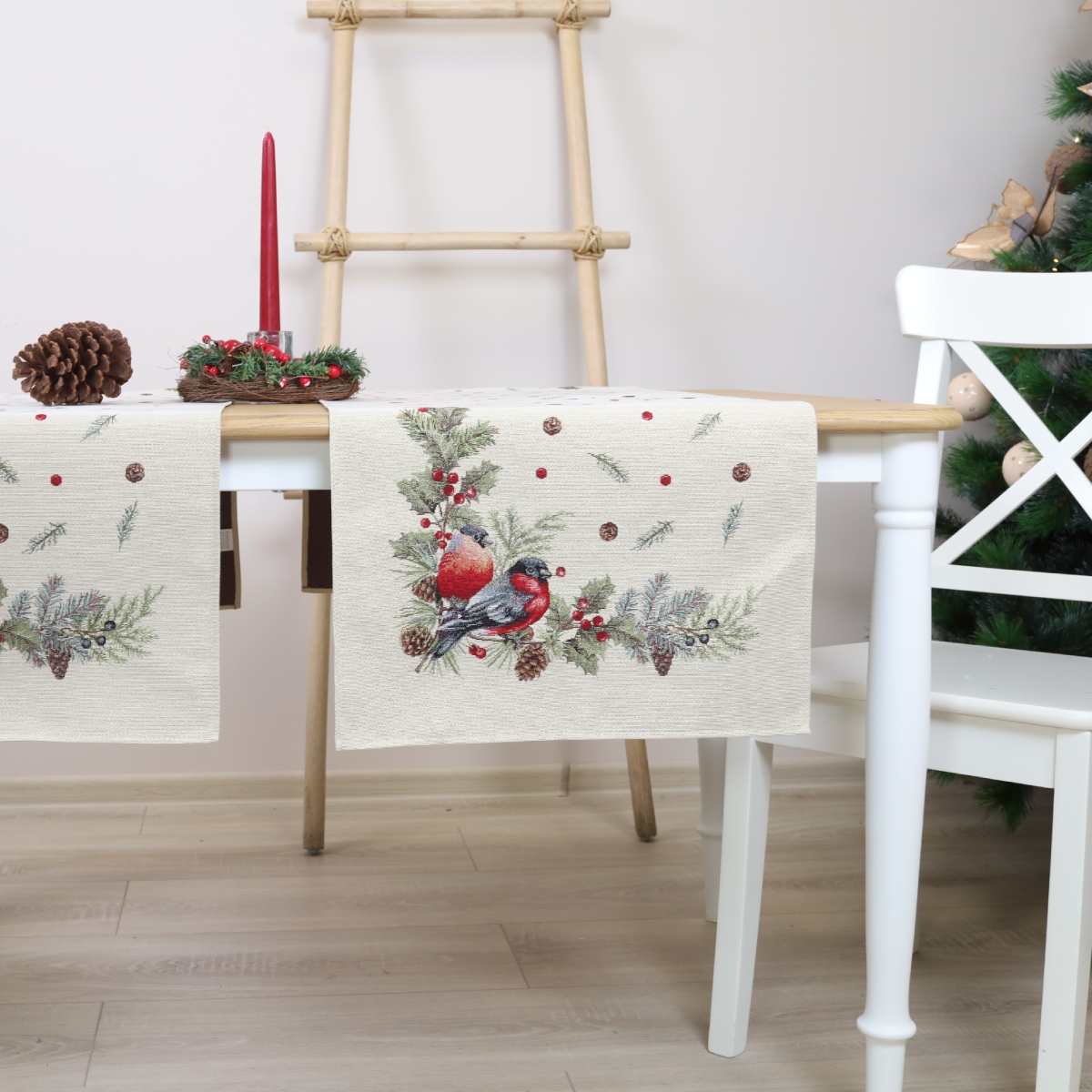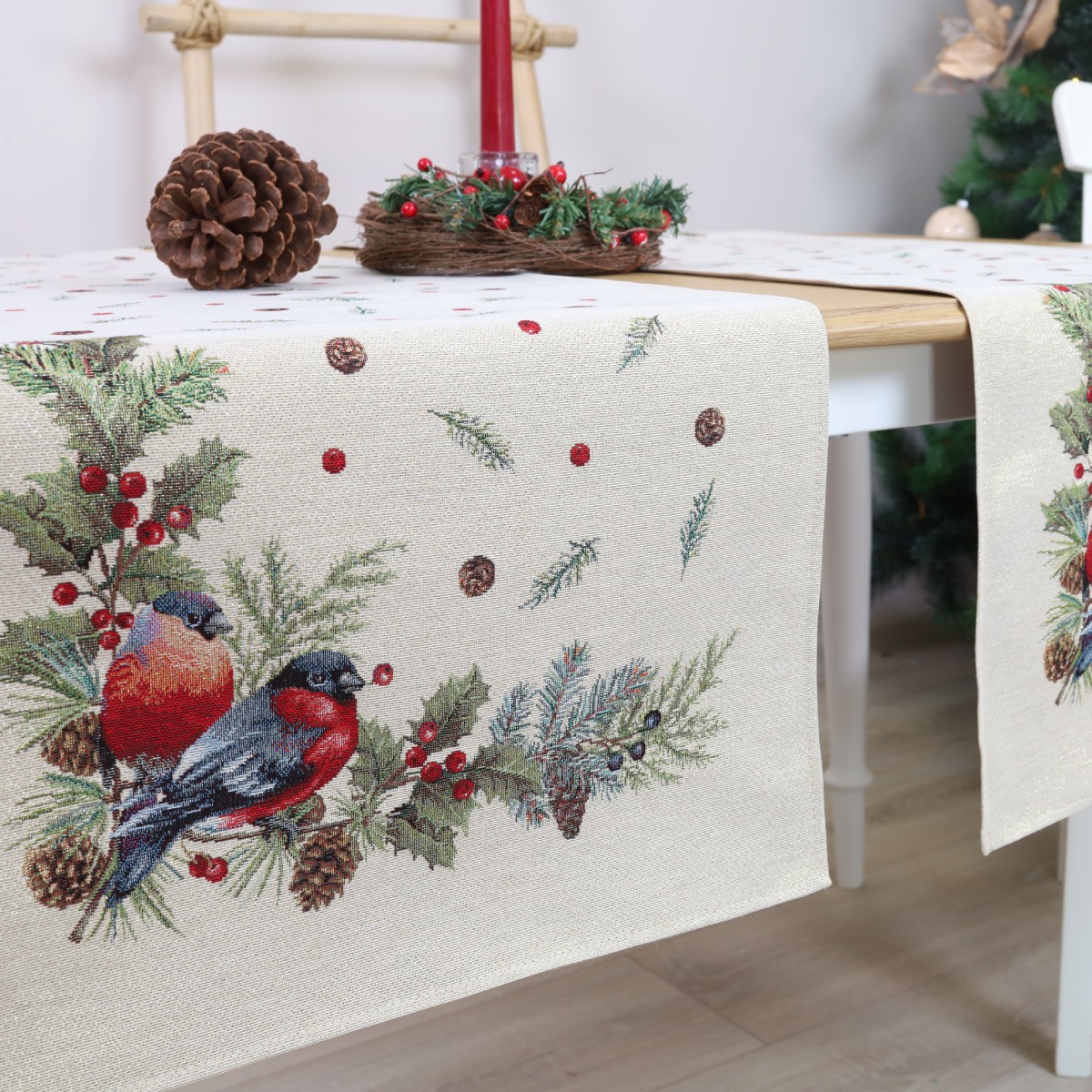 Stalo takelis iš gobeleno medžiagos. Gobelenas yra tankus žakardo audinys. Pagrindas yra sudarytas iš medvilnės, audimo siūlai – mišrios sudėties (poliesterio ir akrilo)